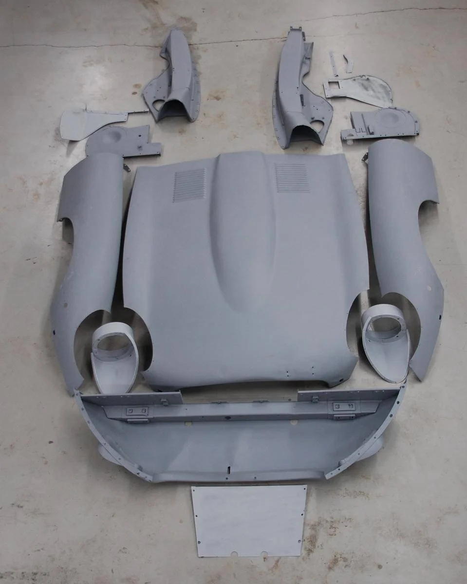 The 2 plus 2 represents possibly the hardest challenge. This amazing shell had no rust at all when stripped to bare metal, and with the dents removed, this car has the nicest body shell we have ever seen of any E-Type.